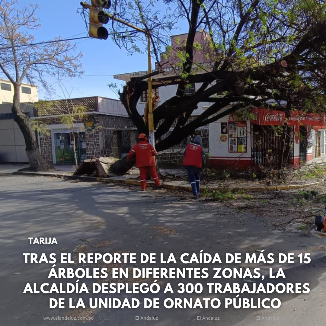 Agencias/El AndaluzLas ráfagas de vientos huracanados generaron la caída de árboles entre otros daños materiales, en ese sentido el alcalde de Tarija, Johnny Torres Terzo, informó que desplegaron varias unidades para trabajar mientras dura la emergencia.Tras el reporte de la caída de más de 15 árboles en diferentes zonas de la ciudad, la Alcaldía de Tarija, desplegó a 300 trabajadores de la unidad de Ornato Público, Dirección de Obras Públicas, la Unidad de Gestión de Riesgos entre otros.“Nos llegaron reportes no solo de árboles caídos, sino también daños en tinglados, techos un auto también resultó afectado y por supuesto que movilizamos a toda nuestra gente para controlar la emergencia, se movilizó maquinaria porque el viento fue realmente fuerte con ráfagas de 70 kilómetros por hora entonces se recomendó a la población evitar salir a las calles y lugares donde hay peligro”, dijo Torres Terzo.Por su parte el director de Obras Públicas, manifestó también que, como medida de precaución, se determinó el cierre de todos los parques de la ciudad, con el objetivo de resguardar la seguridad de la población.“Se registraron caídas de varios árboles y desprendimiento de techos; por precaución hemos cerrado todos los parques, donde tenemos muchos árboles, entonces lo que se pide que cuando ocurren este tipo de vientos huracanados es evitar estar en espacios donde se puedan registrar la caída de árboles, desde que inicio la gestión fuimos remplazando los árboles que ya no son recomendables para que crezcan en el casco viejo de la ciudad, existen otras especies que se adaptan las calles y avenidas del centro de la ciudad”, declaró Zenteno.Finalmente la mencionada autoridad municipal pidió a la ciudadanía mantener la calma y tomar previsiones, además de evitar circular por lugares donde se pueda presentar peligro debido a los fuertes vientos. Navegación de entradasSe dispara el precio de la carne de cerdo en Tarija Convocan a autoridades a una reunión para este jueves por la crisis en salud