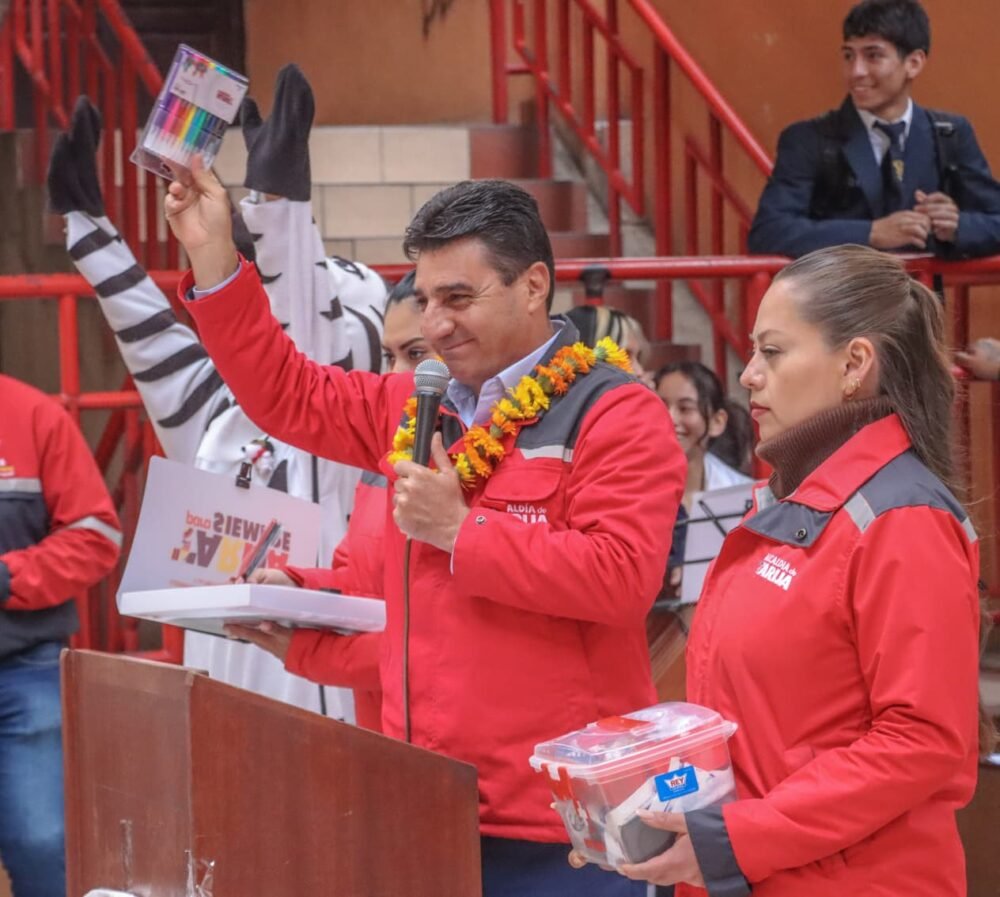 “Entregamos el material escolar a estudiantes de la Unidad Educativa Bolivia, Aniceto Arce y Juana Azurduy de Padilla, estamos a un noventa por ciento de la entrega, por ello me siento feliz, porque siempre he dicho que la única manera de vencer la pobreza es con conocimientos, con educación, por ello recomiendo a todos los jóvenes el de utilizar su tiempo de buena manera, estudiar y ser el día de mañana el triunfador”, dijo, el burgomaestre.