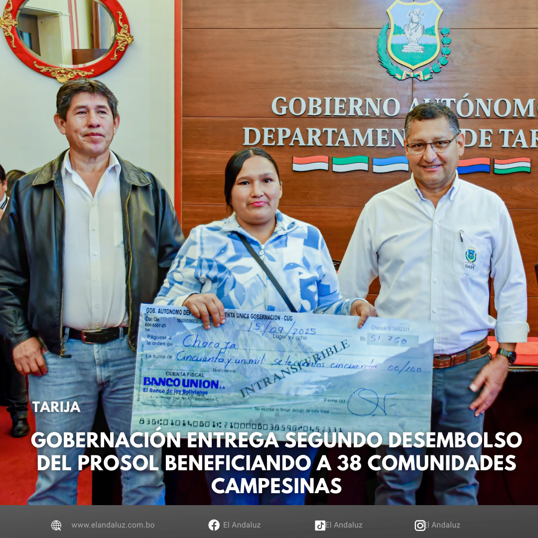 Agencias/El AndaluzEl gobernador del departamento de Tarija realizó este lunes la entrega del segundo desembolso del Programa Solidario Comunal (PROSOL), que en esta ocasión beneficia a 38 comunidades campesinas, alcanzando a 997 familias.Los recursos entregados permitirán a las comunidades invertir en proyectos de tecnificación y fortalecimiento productivo, principalmente en sistemas de riego, compra de implementos agrícolas y adquisición de ganado menor.En el municipio de San Lorenzo, seis comunidades destinarán los fondos a sistemas de riego y equipamiento agrícola. En Uriondo, cuatro comunidades invertirán en la tecnificación del agro; mientras que en Pacaya, siete comunidades priorizarán la compra de maquinaria y una la crianza de ovejas. En Ocono, parte de los recursos se orientará a la adquisición de ganado, proyectos de riego y equipamiento agrícola.“Son buenas decisiones porque ya no se trata de compras de alimentos o semillas que duran apenas una campaña. Ahora son inversiones que permanecen en el tiempo y permiten mejorar la producción campesina”, señaló el Gobernador.Con este desembolso, el PROSOL ha llegado hasta el momento a 109 comunidades y más de 3.000 familias, lo que representa un 30% de cobertura a nivel departamental. La Gobernación prevé continuar con las entregas en los próximos meses, pese al contexto de crisis económica, con el objetivo de ampliar la cobertura.Asimismo, se recordó que el acuerdo con las comunidades campesinas establece que las iniciativas productivas deben orientarse a la captación de agua —a través de la construcción de reservorios y atajados— y a la adquisición de sistemas de riego y equipamiento agrícola, con el fin de garantizar que los recursos se destinen a inversión y no a gasto. Navegación de entradasAlcaldía de Tarija busca consolidar la renovación del parque automotor para EMAT Alcaldía de Tarija realiza limpieza de bocas de tormenta para evitar inundaciones