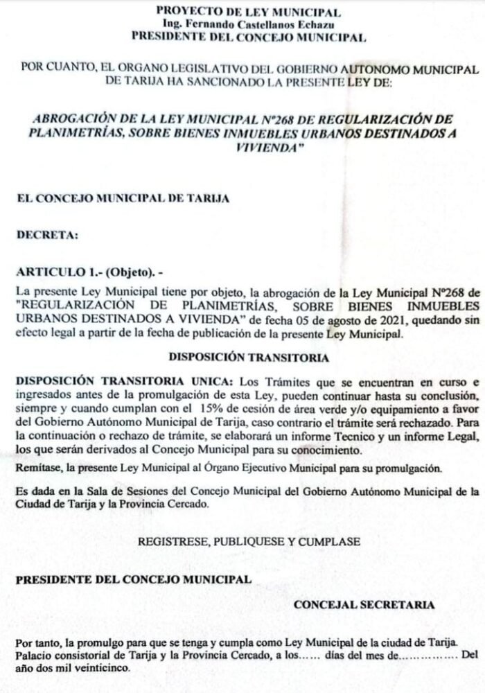 «Lastimosamente, denunciamos, que está Ley 490 que deroga la Ley 468 de regularización, no ha sido socializada como estipula el procedimiento, no ha seguido el procedimiento legislativo, tampoco se ha hecho un informe técnico legal, que respalde está norma, se lo ha metido de contrabando, para la aprobación», expresó.