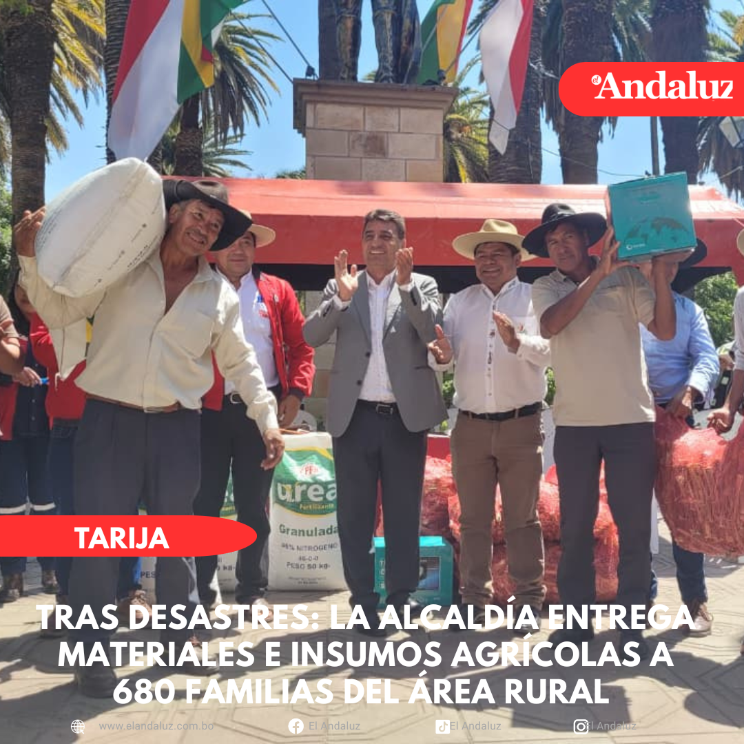 La mañana de este martes el alcalde municipal de Tarija, Johnny Torres Terzo, en acto realizado, se procedió a entregar insumos agrícolas y materiales a las familias de las comunidades que fueron afectadas por el incendio y granizadas que se registraron en la presente gestión.Son 680 las familias beneficiarias de tres subcentrales de la provincia Cercado, mismas que sufrieron pérdidas agrícolas considerables en meses anteriores, producto de los fenómenos naturales.El municipio entregó malla de gavión, colchonetas; fertilizante Urea; caña dulce picada para el forraje del ganado; Bombardier (fertilizante); tubería HDPE 4 Pulgadas y 3 Pulgadas tras el incendio registrado. Navegación de entradasReportan cuatro casos de niños sospechosos de sarampión en Tarija Revendedores acaparan la feria del productor al consumidor y se incrementan los precios