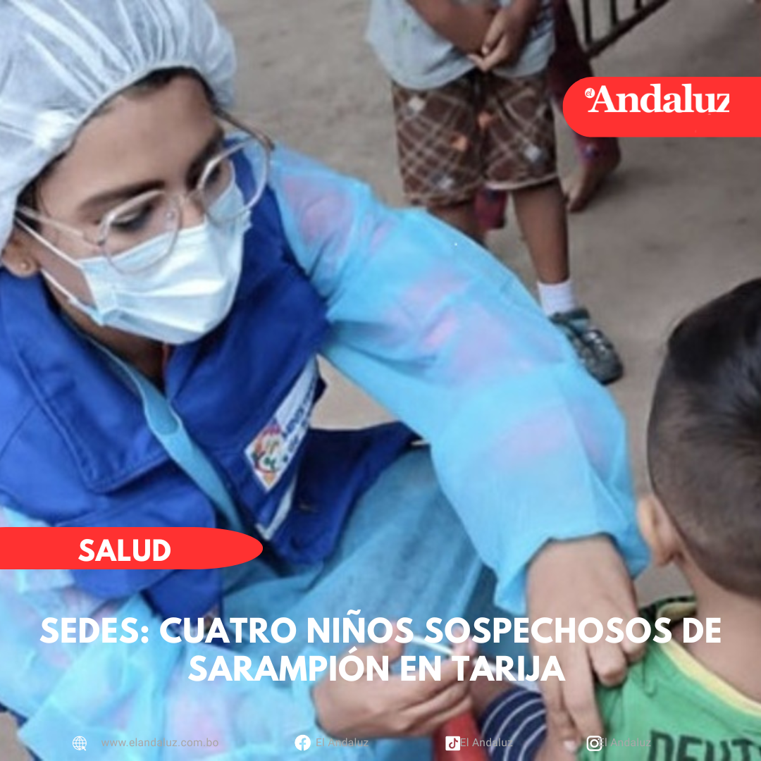 Tras confirmarse el primer caso positivo de sarampión en la ciudad de Tarija, el director del Sedes indicó que se tiene cuatro casos sospechas de niños entre las edades de 8 a 10 años, mismo que habrían tenido un un nexo epidemiológico.Nils Cazón dijo que las muestras de estos cuatro casos están siendo remitidas a laboratorio para confirmar o rechazar la enfermedad. Así mismo se esta realizando un seguimiento clínico a estos menores.“Estos niños actualmente se encuentran en buen estado no tienen complicaciones y esperamos que entre mañana y el jueves podamos conocer estos resultados”, expresó la autoridad de salud.Se trata de tres niños del barrio San Jorge, zona donde se registró el primer caso confirmado de sarampión y un niño del barrio Tabladita de la cuidad de Tarija.El director del Sedes dijo que el porcentaje de vacunación no supera el 50%, por lo que insta a los padres de familiar acudir a los centros de salud para que los niños puedan acceder a la vacuna contra el sarampión.Por Rosy Sánchez/El Andaluz Navegación de entradas«Yo he construido nueve hospitales», la frase de Rodrigo Paz que generó malestar e indignación en Tarija La alcaldía de Tarija entrega materiales e insumos agrícolas a 680 familias del área rural