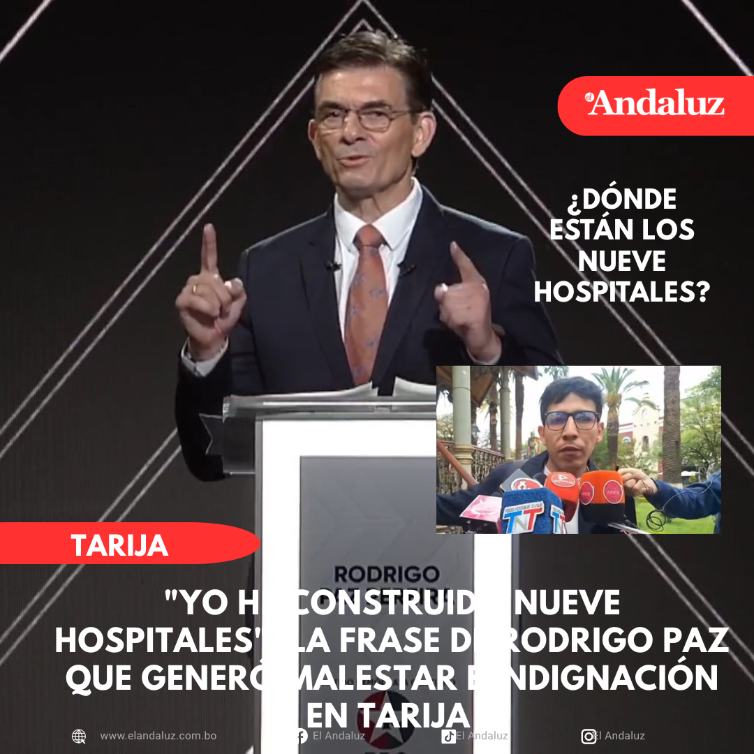 Osmar Arroyo/El AndaluzLas declaraciones del candidato a la presidencia por el Partido Demócrata Cristiano (PDC), Rodrigo Paz Pereira, en el debate del domingo pasado sobre salud y la construcción de nueve hospitales, ha generado molestia en Tarija.En la presentación de sus propuestas, en el eje temático de salud y educación, el candidato señaló que la salud es una necesidad, que van a respaldar, indicando que se asignará un mayor presupuesto.«Yo he construido nueve hospitales y haces la infraestructura y no hay quien atienda, porque el sistema, evidentemente no funciona», mencionó Paz, refiriéndose a los recursos humanos.Desde el Movimiento cívico, el presidente del Comité Cívico Juvenil de Tarija, Fernando Leyton señaló que hay tanta falsedad al momento de hacer política,«El día de hoy, me he levantado buscando nueve hospitales y he encontrado uno cayéndose a pedazos, que ni siquiera está funcionando como debería y es algo lamentable», expresó.Reiteró que, no conoce los nueve hospitales o nueve centros de salud, que Rodrigo Paz, haya dejado en buen funcionamiento, en su gestión como alcalde de Tarija.«Lastimosamente en Tarija, la salud es algo crítico que atravesamos», apuntó el dirigente cívico juvenil.Ante la pregunta, si Rodrigo Paz habría mentido sobre ese tema, respondió que, lastimosamente, sí.Que mucha gente hace fila en el hospital San Juan de Dios, mencionando, que es el único, que cuenta con la atención en especialidades médicas.«El señor Rodrigo Paz, debe decirnos, dónde es, que están los nueve hospitales», dijo Fernando Leyton.La concejal municipal de Tarija, Marcela Guerrero indicó a El Andaluz que, evidentemente, Rodrigo Paz dijo eso en el debate.Para Guerrero, sería interesante, que el candidato aclare, cuáles son, esos nueve hospitales, remarcando que un hospital no es lo mismo que un centro de salud, o una Posta de salud.«Yo creo que, veo una desesperación no, a ver, de cómo captar el tema de votación y creo que se ha dejado llevar un poco por los nervios, para comentar este tipo de situaciones, porque en la realidad, más bien nosotros estamos batallando para poder construir», aseveróPara la concejal municipal, en Tarija, se tienen muchas falencias en salud, varias necesidades por atender.«Creo que hay una falta a la verdad», dijo Guerrero sobre la declaración de Rodrigo Paz.Por otra parte, indicó que hubo observaciones en varios proyectos de la gestión municipal de Rodrigo Paz y que los proyectos mal ejecutados, ha tenido que arreglarlo el actual alcalde de Tarija, Johnny Torres.En muchos casos han pedido auditorías, muchas obras se concluyeron en la actual gestión, otras, se tuvo que empezar de cero.«Eso es lo que le molesta al tarijeño, que se digan cosas, se quieran tomar atributos, al igual que el puente 4 de Julio, el puente denominado millonario, atribuyes una obra que está culminada, terminada, mal ubicada, pero que, en realidad, no es gracias a Rodrigo Paz que se terminó ese puente, fueron decisiones del actual alcalde municipal», agregó.La concejal indicó, que el debate presidencial podía haberse concentrado, más en temas de interés de la gente, que solo se hicieron promesas, que no se sabe cómo se van a ejecutar.La gente quiere saber, como se gobernará, cuáles serán las primeras acciones, dijo la concejal, que hay algunas contradicciones entre candidatos a presidente y vicepresidente ñ, por un lado, dicen que se quitará la subvención al combustible, el candidato a vicepresidente dice que no se quitará la subvención.Debate presidencialEl gobernador del Gobierno Autónomo Departamental de Tarija (GADT), Oscar Montes se refirió al escenario electoral, a pocos días de la segunda vuelta de las elecciones nacionales.Mencionó que Jorge Tuto Quiroga, fue ministro y vicepresidente de Bolivia, luego pasó a ser presidente, que solo fue autoridad en dos gestiones gubernamentales.«Paz dice que ha estado seis, entonces querer presentarse de renovador, cuando ha estado seis gestiones, el otro ha estado apenas dos, me parece que ese discurso, nadie lo cree. Aquí, lo que está en juego, es como salimos de la crisis», apuntó.Para Montes, con el debate presidencial, ha quedado evidente, que sabe cómo sacar a Bolivia de la crisis, que esa persona es Tuto Quiroga.«Al final del debate, el candidato del PDC, Rodrigo Paz dijo, votemos por Libre, creo que él, hizo un buen resumen de todo lo que ha sido el debate, porque hasta él mismo, se convenció que Tuto es el que va sacar de la crisis al país», finalizó. Navegación de entradasCuestionan demora en la auditoría al proyecto de «Ciudad Inteligente» Reportan cuatro casos de niños sospechosos de sarampión en Tarija