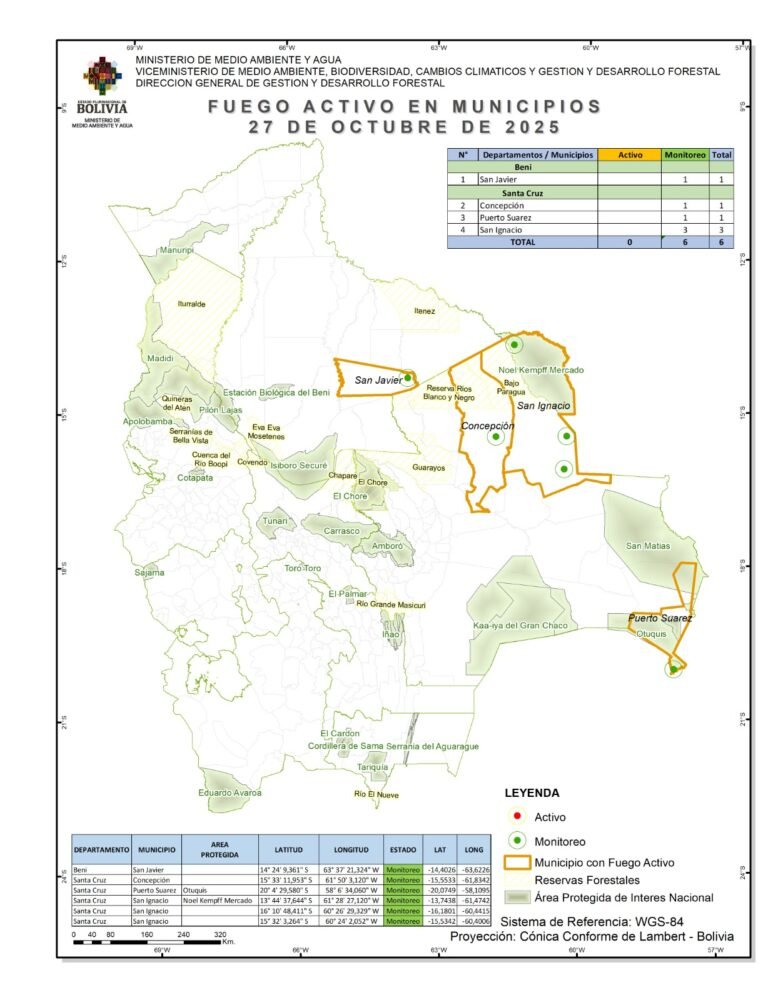 El reporte del Ministerio de Medio Ambiente y Agua sobre los focos de calor en el territorio nacional, indica que, ayer lunes, se registró fuegos activos cero y seis en monitoreo.