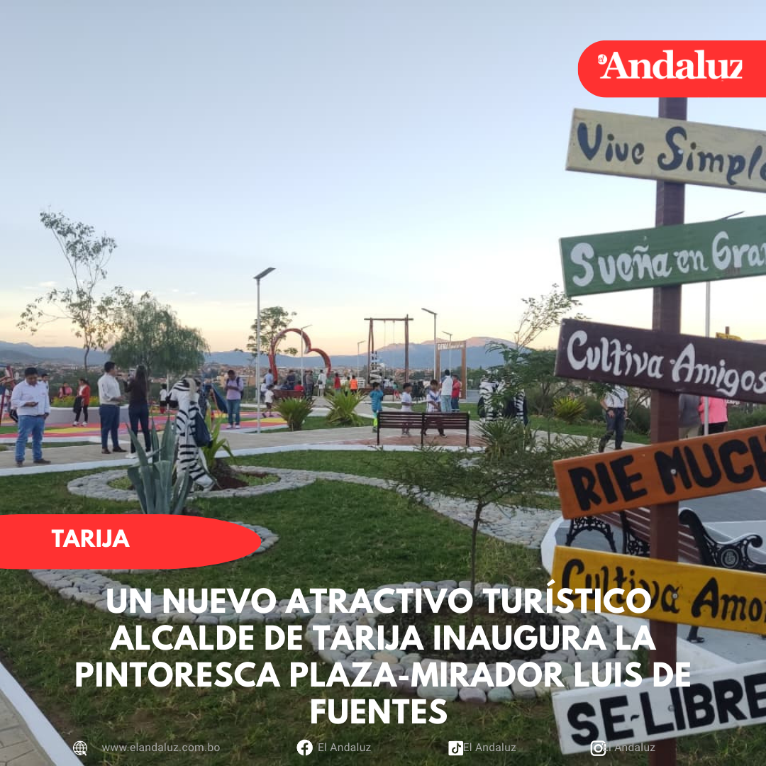 Agencias/El AndaluzTarija estrena un nuevo atractivo turístico, en la víspera el alcalde de Tarija, Johnny Torres Terzo, inauguró una novedosa obra una Plaza-Mirador en el barrio Luis de Fuentes.La máxima autoridad municipal, Indicó que dicha obra contribuye al movimiento turístico. La obra tuvo un costo de 85 mil bolivianos. Además, se valora que dicho lugar es área verde recuperada, la cual antes estaba abandonada y con riesgo de avasallamiento.«Esta es la mejor forma de recuperar las áreas verdes, evitar que sean avasalladas, nuestro deber es recuperar las áreas verdes y ponerlas a disposición de la población, esta obra cuenta con tres figuras para que la gente venga sacarse fotografías, tenemos la figura de un corazón, una placa y el columpio», dijo Torres Terzo.La obra también cuenta con juegos para niños, además de contar con. Iluminación led que funciona con paneles solares.Por su parte el presidente del barrio Luis de Fuentes, Grover Baldiviezo, reconoció el trabajo del alcalde, ya que dicha obra generará movimiento económico, porque se convertirá en un importante atractivo turístico.«La verdad, muy felices por esta obra tan hermosa que se convertirá en un referente turístico, antes este lugar estaba abandonado y con riesgo de ser avasallado, pero gracias al Alcalde que de verdad tiene esa visión de convertir a Tarija en una ciudad turística», Baldiviezo. Navegación de entradasHasta este lunes se presentaron tres postulantes para vocales del Tribunal Electoral Departamental PTAR San Blas opera a pérdida: Entre 170 y 180 mil bolivianos es el costo de operación por mes