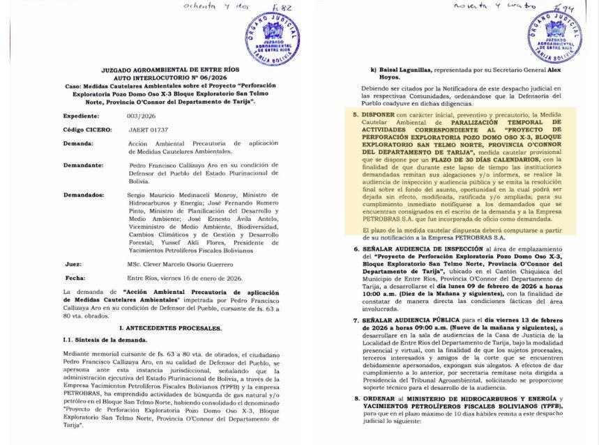 A través de sus redes sociales, el Defensor del Pueblo, Pedro Callisaya, informó, la tarde de este viernes, que el Juzgado Agroambiental de Entre Ríos admitió la solicitud de medidas cautelares ambientales presentada por la Defensoría del Pueblo, disponiendo la suspensión temporal de los actos de ejecución material del Proyecto Perforación Exploratoria Pozo Domo Oso X-3, Bloque Exploratorio San Telmo Norte, ubicado en la provincia O’Connor del departamento de Tarija, área vinculada a la Reserva Nacional de Flora y Fauna Tariquía.