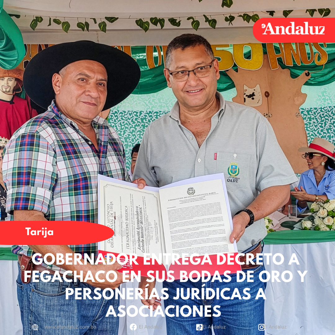 Agencias/El AndaluzEn un acto conmemorativo por los 50 años de vida institucional de la Federación Ganadera del Chaco (FEGACHACO), el Gobernador del Departamento, Oscar Montes Barzón, hizo entrega oficial del Decreto Departamental Nº 002/2026 a la presidenta de esta entidad, mediante el cual se otorga un reconocimiento y distinción institucional meritoria por su trayectoria y aporte al desarrollo productivo del Gran Chaco.El decreto, en su artículo único, reconoce a FEGACHACO por sus cincuenta años de existencia institucional, dedicados a proteger, incentivar, organizar y apoyar a los productores y ganaderos de la región chaqueña, contribuyendo al fortalecimiento de sus capacidades productivas en beneficio de toda la población.Durante el acto, la primera autoridad departamental también realizó la entrega de personerías jurídicas a la Asociación Agroganadera Colinas de Capirenda (AGACCAP) y a la Asociación Agroganadera Cañada Bolívar (AGACABOL), las cuales, a partir de este reconocimiento, pasan a ser entidades legalmente reconocidas por el Estado boliviano.El Gobernador explicó que la entrega de estos documentos oficializa un trámite previamente realizado ante notario de fe pública, conforme a la normativa nacional, permitiendo que las asociaciones cuenten con un marco legal claro para su funcionamiento, la elección de sus dirigentes y la toma de decisiones institucionales.Asimismo, destacó que contar con personerías jurídicas permitirá a las asociaciones fortalecer su organización interna, resolver conflictos de manera más ágil y avanzar con mayor rapidez en el cumplimiento de sus objetivos, garantizando el respeto a sus estatutos y promoviendo una gestión transparente y participativa.Con estas acciones, la Gobernación reafirma su compromiso de apoyar al sector ganadero y productivo del Chaco, promoviendo la institucionalidad, la organización y el desarrollo sostenible en beneficio de las comunidades del municipio de Villa Montes y del departamento. Navegación de entradasLa Gobernación con el Materno Infantil impulsan campaña solidaria “Manitos” para pacientes de escasos recursos Ley Antibloqueos amenaza a comunarios de Tariquía, que ya enfrentan juicios por defender la reserva