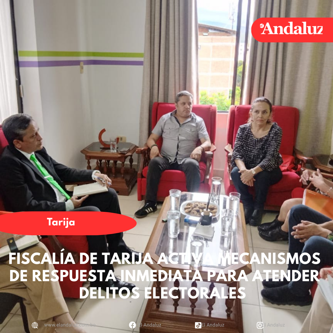 Agencias/El AndaluzEl Fiscal Departamental de Tarija, José Ernesto Mogro Palacios, informó que en concordancia con los acuerdos asumidos desde la Fiscalía General del Estado y luego de la reunión de coordinación interinstitucional con autoridades del Tribunal Electoral Departamental (TED), se garantiza la atención prioritaria e inmediata a todas las denuncias relacionadas con delitos electorales durante el desarrollo de las elecciones subnacionales. Esta coordinación interinstitucional tiene como objetivo asegurar una respuesta oportuna del sistema de justicia ante cualquier irregularidad que pudiera presentarse durante las elecciones.“Estas acciones de coordinación responden a las directrices del Fiscal General del Estado, Roger Mariaca Montenegro, quien nos instruyó fortalecer el trabajo operativo del Ministerio Público en procesos electorales, a fin de resguardar la legalidad, los derechos ciudadanos y el normal desarrollo de las elecciones”, manifestó Mogro.Por su parte, la Coordinadora Departamental de la Fiscalía de Tarija, Lesly Alemán, destacó que la coordinación entre instituciones es fundamental para consolidar la confianza de la población en el proceso electoral, en ese sentido, el Ministerio Público desplegará a Fiscales de Materia y personal de apoyo, quienes mantendrán presencia activa en los distintos recintos electorales del departamento de Tarija, con el objetivo de atender de manera directa e inmediata cualquier eventualidad que pudiera presentarse. Navegación de entradasGobernador presenta Informe de Rendición de Cuentas Final Gestión 2025 Rechazan posible traslado de la administración de la Unefco de Tarija a La Paz