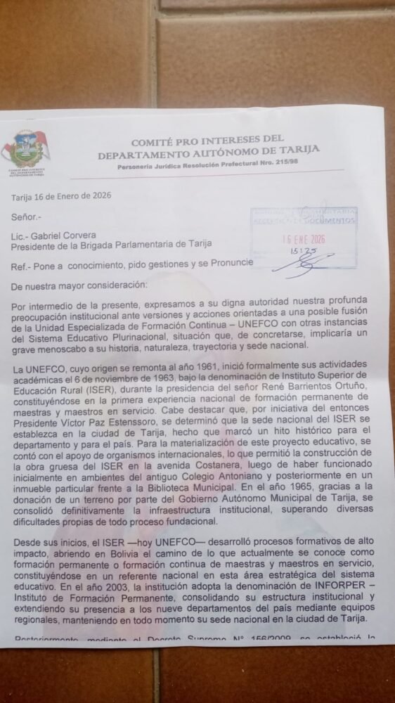 El presidente del Comité Pro Intereses del Departamento de Tarija, Jesús Gira informó a El Andaluz que se hizo llegar una nota al presidente de la Brigada Parlamentaria de Tarija, por el tema de educación.