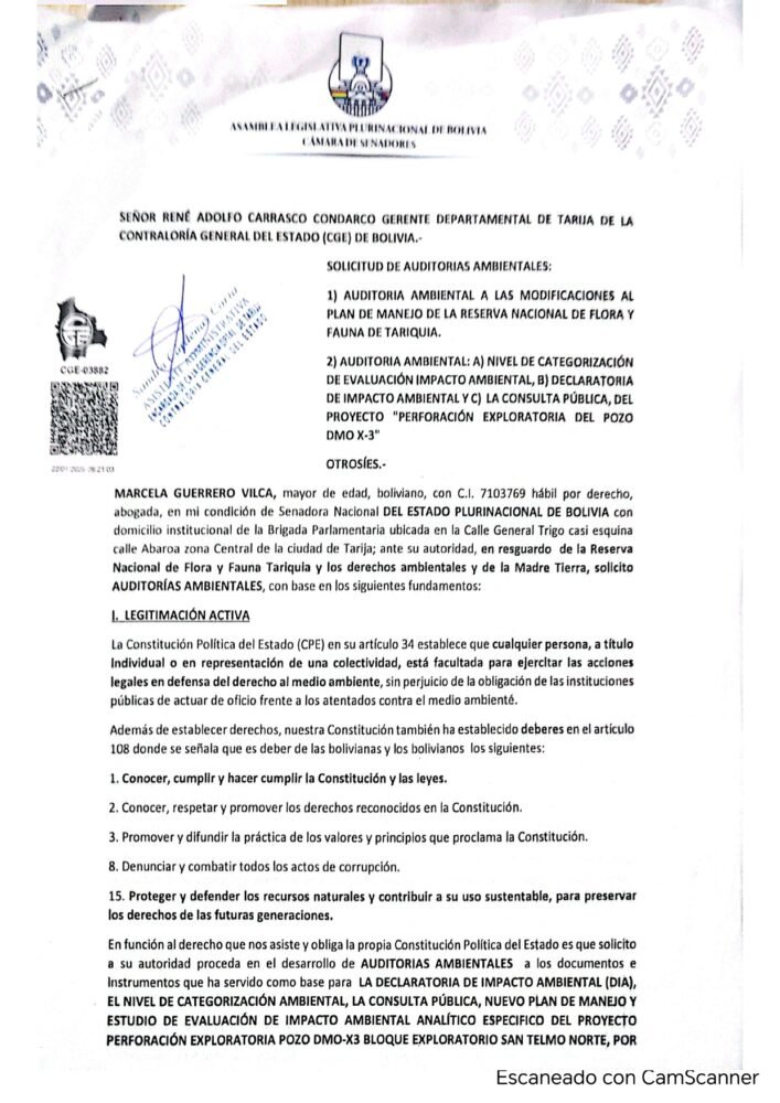 Sobre la solicitud de auditoría ambiental presentada ante la Contraloría, explicó que la primera solicita una auditoría ambiental a las modificaciones al Plan de Manejo de la reserva nacional de Flota y Fauna de Tariquía y una auditoría ambiental al nivel de categorización y evaluación del impacto ambiental, la declaración del impacto ambiental y la consulta pública del proyecto de exploración, de perforación del pozo Domo Oso X3.