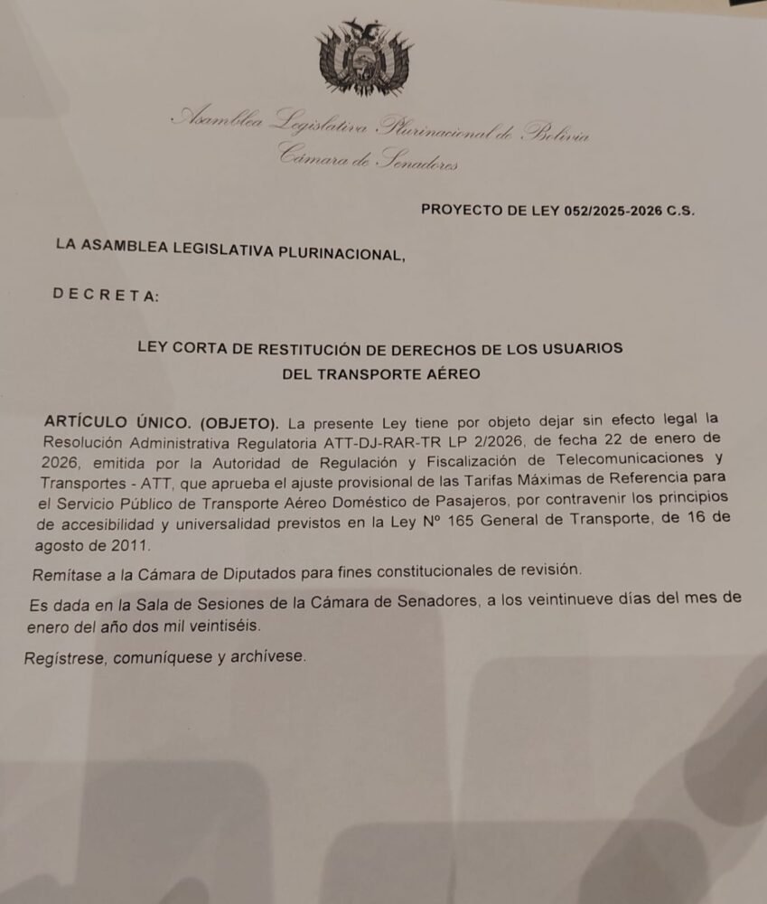 La senadora Marcela Guerrero informó a El Andaluz que este jueves, en la Cámara de Senadores se aprobó con dos tercios, la Ley Restitución de Derechos de los Usuarios del Transporte Aéreo, para dejar sin efecto la resolución que incrementa la tarifa de pasajes.