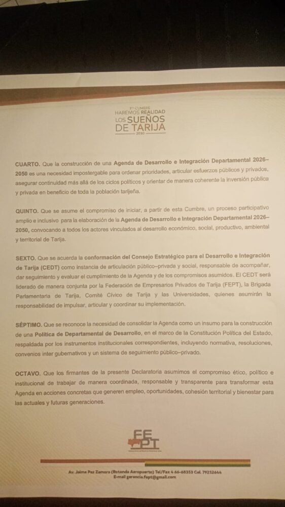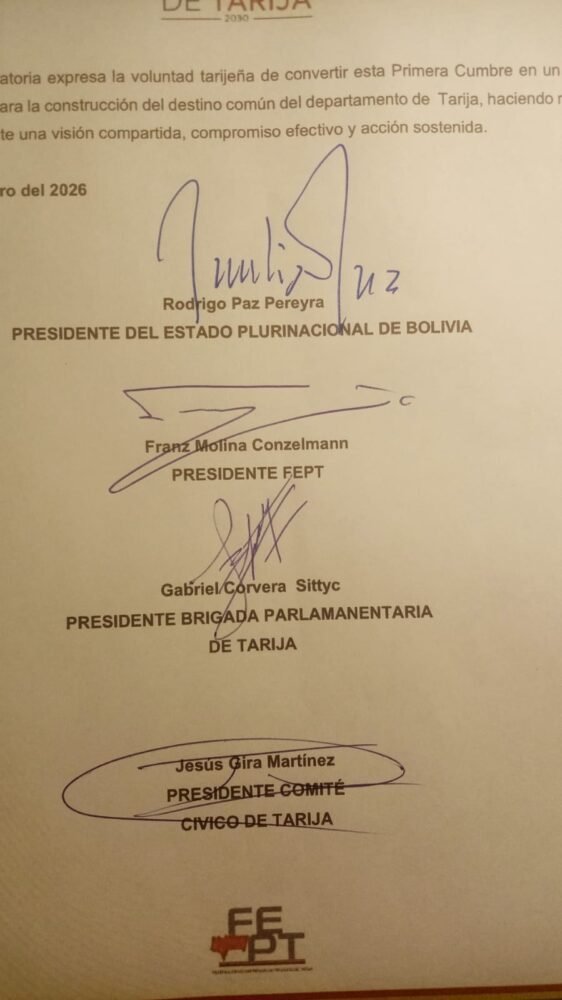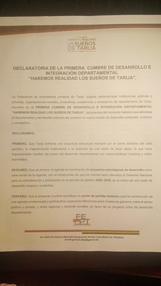 El presidente del Comité Pro Intereses del Departamento de Tarija, Jesús Gira informó a El Andaluz que se emitió una Declaratoria de la primer Cumbre de Desarrollo, que firma el presidente, autoridades e instituciones del departamento, en la que se ratifica lo que, en primera instancia, se firmó en el compromiso de Rodrigo Paz con Tarija.