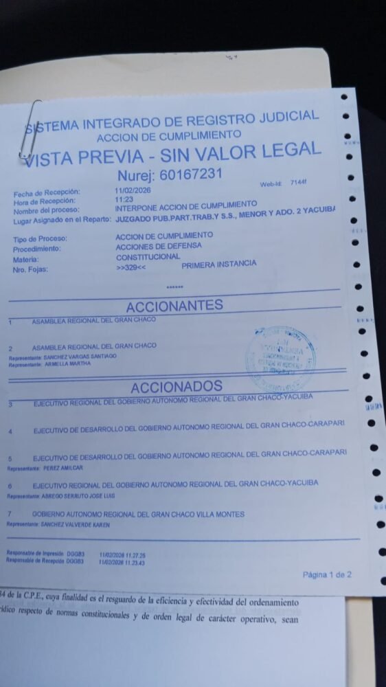 La Asamblea Regional del Gran Chaco interpuso una acción de cumplimiento en contra del ejecutivo del Gobierno Autónomo Regional del Gran Chaco, José Luis Abrego y en contra de los ejecutivos Seccionales de Desarrollo de Caraparí y Villa Montes, por el incumplimiento con la transferencia de recursos económicos en los meses de diciembre y enero.
