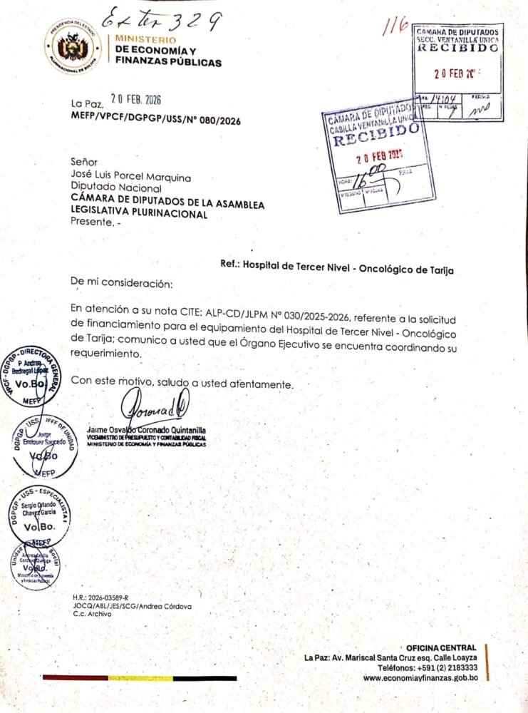 «En atención a su nota CITE ALP-CD/JLPM N° 030/2025-2026, referente a la solicitud de financiamiento para el equipamiento del hospital de Tercer Nivel – Oncológico de Tarija; comunicó a usted que el Órgano Ejecutivo se encuentra coordinando su requerimiento», señala la nota de respuesta, firmada por el viceministro de Presupuesto y Contabilidad Fiscal, Jaime Osvaldo Coronado.