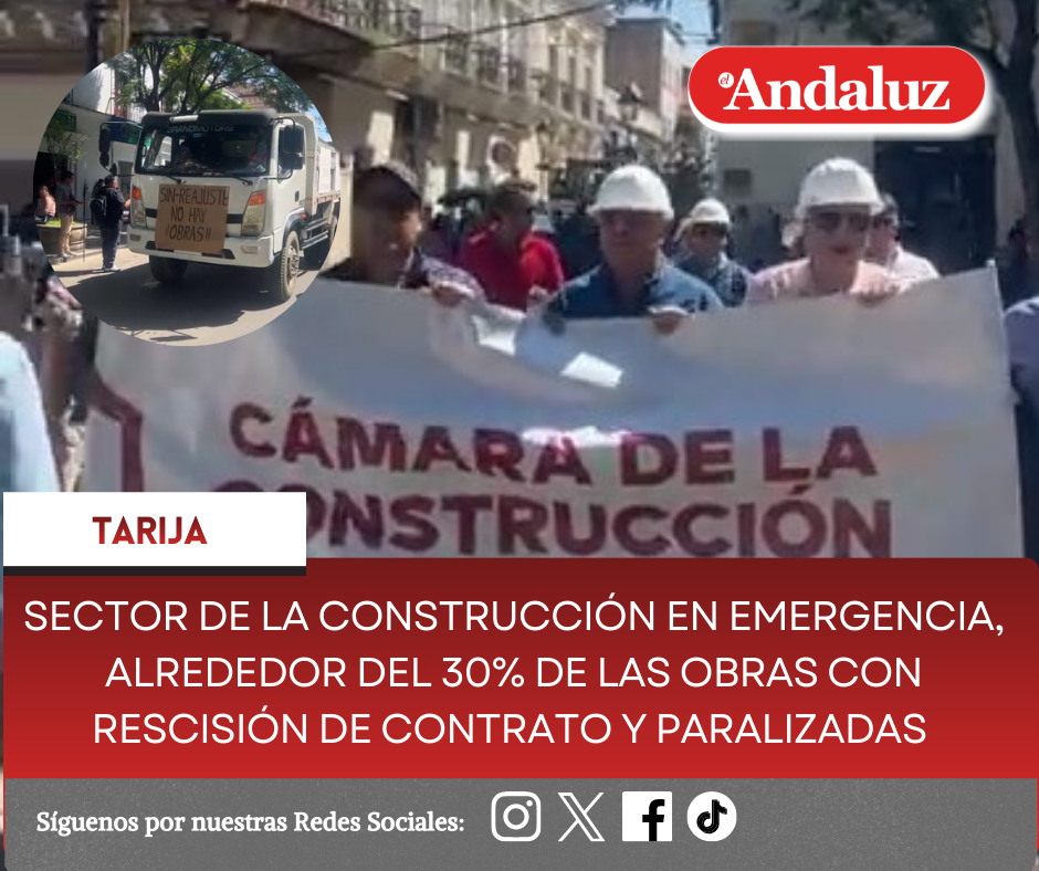 Osmar Arroyo/El AndaluzEl sector de la construcción se movilizó en la pasada jornada, para al gobierno nacional el ajuste de precios de los materiales de construcción.El presidente de la Cámara Departamental de la Construcción de Tarija (Cadeco), Rolando Zurriable indicó que no se pueden concluir las obras, que los materiales de construcción subieron en un promedio, en un 65 por ciento y global en un 40 por ciento.Mencionó que aproximadamente, en un 30 por ciento de las obras se encuentran en resolución de contrato y paralización de obras y con problemas legales, con multas y con intenciones de resolución de contrato señaló que se debe tener en un 80 por ciento.Está situación está asfixiando a muchas empresas, que se encuentran en riesgo de cerrar sus puertas.«Yo creo que va a ser un 50 por ciento, por lo menos hasta que esto se reactive, si es que el gobierno sigue demorando», expresó.Señaló que el Decreto Supremo para el reajuste de precios debe tener tres puntos importantes, que primero debe de reajustarse los precios en materiales, mano de obra y equipo de construcción.También debe decir el Decreto, es que durante este tiempo, desde el 17 de diciembre del 2025, debe haber una ampliación de plazo hasta la emisión del Decreto, para que todos los contratos puedan ser reacomodados.El tercer punto, que las empresas constructoras puedan rescindir el contrato, dejando las obras, protegidas, si es que el gobierno no puede pagar las obras con el reajuste de precios.Remarcó, que esos tres puntos son escensaciales para dar seguridad jurídica a la industria de la construcción.«En este momento, nosotros como industria de la construcción no tenemos seguridad jurídica, ya que firmamos un contrato sin reajuste de precios, pero al final el gobierno hace medidas económicas y no da las medidas correctivas también para el sector», apuntó.Reiteró, que el sector se encuentra en plena movilización y en plena resolución de contrato en diferentes proyectos.«Ya estamos en un 30 por ciento, si sigue demorando, a fin de mes por ahí, ya será un 40, un mes más por ahí, será el 50 y así las empresas van a ver su parte legal, para poder terminar de rescindir sus contratos y dejar de perder su patrimonio», agregó.Por último, dijo que será la Cámara Boliviana de la Construcción (Caboco), la instancia que definirá una movilización nacional y será sorpresiva.Osmar Arroyo/El AndaluzEl sector de la construcción se movilizó en la pasada jornada, para al gobierno nacional el ajuste de precios de los materiales de construcción.El presidente de la Cámara Departamental de la Construcción de Tarija (Cadeco), Rolando Zurriable indicó que no se pueden concluir las obras, que los materiales de construcción subieron en un promedio, en un 65 por ciento y global en un 40 por ciento.Mencionó que aproximadamente, en un 30 por ciento de las obras se encuentran en resolución de contrato y paralización de obras y con problemas legales, con multas y con intenciones de resolución de contrato señaló que se debe tener en un 80 por ciento.Está situación está asfixiando a muchas empresas, que se encuentran en riesgo de cerrar sus puertas.«Yo creo que va a ser un 50 por ciento, por lo menos hasta que esto se reactive, si es que el gobierno sigue demorando», expresó.Señaló que el Decreto Supremo para el reajuste de precios debe tener tres puntos importantes, que primero debe de reajustarse los precios en materiales, mano de obra y equipo de construcción.También debe decir el Decreto, es que durante este tiempo, desde el 17 de diciembre del 2025, debe haber una ampliación de plazo hasta la emisión del Decreto, para que todos los contratos puedan ser reacomodados.El tercer punto, que las empresas constructoras puedan rescindir el contrato, dejando las obras, protegidas, si es que el gobierno no puede pagar las obras con el reajuste de precios.Remarcó, que esos tres puntos son escensaciales para dar seguridad jurídica a la industria de la construcción.«En este momento, nosotros como industria de la construcción no tenemos seguridad jurídica, ya que firmamos un contrato sin reajuste de precios, pero al final el gobierno hace medidas económicas y no da las medidas correctivas también para el sector», apuntó.Reiteró, que el sector se encuentra en plena movilización y en plena resolución de contrato en diferentes proyectos.«Ya estamos en un 30 por ciento, si sigue demorando, a fin de mes por ahí, ya será un 40, un mes más por ahí, será el 50 y así las empresas van a ver su parte legal, para poder terminar de rescindir sus contratos y dejar de perder su patrimonio», agregó.Por último, dijo que será la Cámara Boliviana de la Construcción (Caboco), la instancia que definirá una movilización nacional y será sorpresiva. Navegación de entradas¿Por qué Never Antelo lidera la intención de voto? Los 5 pilares que buscan transformar Tarija este 22 de marzo Molestia por la falta de atención de autoridades municipales al tema de salud en Bermejo