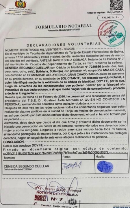Mediante una declaración jurada presentada ante Notario de Fe Pública, la denunciante confirmó la autenticidad de su denuncia y de su firma, desmintiendo las versiones difundidas por dirigentes de CDC que intentaron desacreditar el documento y poner en duda la identidad de la persona que presentó la recusación.