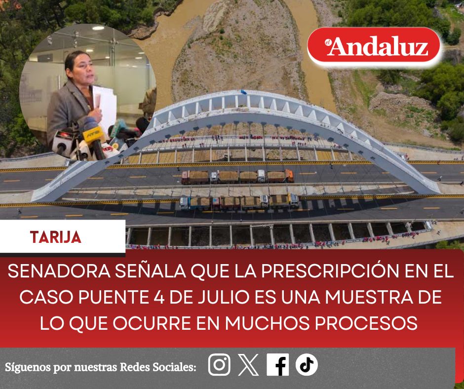 Osmar Arroyo/El AndaluzEn pasados días se ha hecho conocer, sobre la prescripción de la acción penal en el caso del Puente 4 de Julio, por mayor tiempo de duración.El Código de Procedimiento Penal, establece un tiempo de duración de tres años, en un proceso penal y en el caso del Puente, llevaba más de tres años y cinco meses, por lo que se planteó la excepción de extinción de la acción penal, la que fue resuelta en enero pasado, dando viabilidad al recurso planteado.La senadora Marcela Guerrero indicó a El Andaluz que este caso, es una muestra y que todos los procesos de investigación apuntan a eso, que se dilatan y luego deriva en la prescripción del proceso.«Está es la muestra de muchos otros casos, dónde buscan, de alguna manera extinguir el tema de la pena. Yo creo que este tema del puente 4 de Julio, al no percatarse de este tema, en este caso, ha consolidado nomás la extinción de la pena, entonces, habrá que ver otros recursos, habrá que analizarla», expresó.Pidió que el Concejo Municipal de Tarija, debe pronunciarse sobre este tema de manera oficial.Por su parte, el dirigente de la Federación Departamental de Juntas Vecinales de Tarija (Fedjuve), Edwin Arana indicó que se pedirá a los nuevos concejales municipales, que se tomen todas las acciones que se requieren sobre este tema.Señaló que habría que ver el marco legal, para buscar que este caso se retome y se siga investigando, ante posibles hechos de corrupción, más aún, al tratarse de un proyecto que costo mucho dinero.Además, del proyecto del Puente 4 de Julio, indicó que son varios temas que salen a la luz, de supuestas irregularidades, en compra de vehículos, de pantallas, entre otros. Navegación de entradasTariquía: Transparencia y respeto al debido proceso el pedido de la Defensoría, tras conocer resolución del Tribunal Agroambiental Crece el apoyo para Adrián Oliva: Logran acuerdo con el MTS y anuncian que se sumarán otras fuerzas políticas