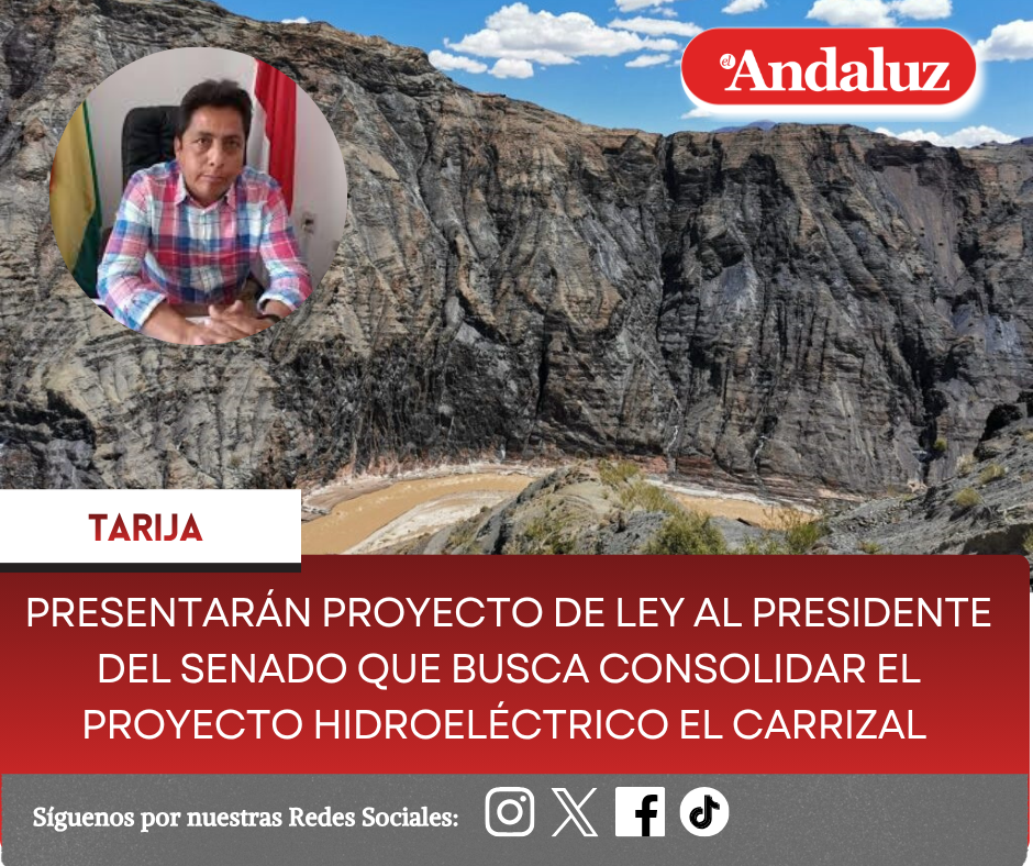 Osmar Arroyo/El AndaluzEl presidente del Comité Pro Intereses del Departamento de Tarija, Jesús Gira informó a El Andaluz que el movimiento cívico tomó la decisión de impulsar y viabilizar el proyecto de la Planta Hidroeléctrica El Carrizal.Mencionó que primero, se realizó una inspección en el lugar en donde se emplazará el proyecto, luego se trabajó en el diseño final del proyecto y por último se tiene concluido el proyecto, que es objeto de análisis, por parte de la comisión técnica del Comité Cívico que está conformada por varias instituciones, profesionales, personalidades, personas técnicas que trabajaron en el estudio del proyecto.Gira indicó que, ahora se ha tomado la decisión, de que se pueda plasmar este proyecto, un anhelo de todos los tarijeños, más aún, cuando se habla que se viene una crisis energética en el país.El dirigente cívico anunció que este martes se presentará el proyecto al presidente de la Cámara de Senadores, Diego Ávila, para la creación de la unidad ejecutora del proyecto hidroeléctrico El Carrizal.Se espera que en la instancia legislativa se pueda hacer un trabajo a detalle sobre el tema.Se aprovechará que este martes se realizará la sesión de honor del Senado en conmemoración a los 209 años de la batalla de La Tablada.Jesús Gira destacó el trabajo y la voluntad de autoridades de Tarija y Chuquisaca, el Movimiento cívico de los dos departamentos y otras instituciones, que están poniendo un granito de arena para que se pueda concretar este proyecto.Explicó la importancia del proyecto, señalando que dentro de sus componentes también está el tema riego y energía eléctrica para el Valle Central de Tarija, además del turismo, que ese lugar se convertirá en un atractivo.Mencionó que este proyecto es multipropósito y saludo el apoyo de las autoridades nacionales para que se pueda avanzar en la consolidación del proyecto.LEY CREACION UNIDAD EJECUTORA CARRIZAL ULTIMODescarga Navegación de entradasPiden a las autoridades de los tres niveles de gobierno sentarse en una mesa y resolver los problemas en el sistema de salud Plantean profundizar el debate en mesas de trabajo sobre cambios que proponen en la Ley Brisa sobre delitos sexuales
