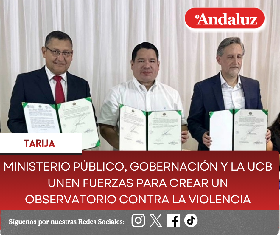 El Ministerio Público, el Gobierno Autónomo Departamental de Tarija y la Universidad Católica Boliviana «San Pablo» Sede Tarija, suscribieron un Convenio de Cooperación Interinstitucional para la creación, implementación y funcionamiento del Observatorio Departamental de Desarrollo e Innovación que busca generar información estratégica, estudios especializados, producción de conocimiento y prevención de la violencia.
