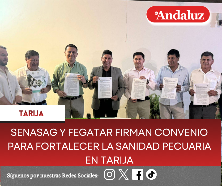 Agencias/El AndaluzEl Servicio Nacional de Sanidad Agropecuaria e Inocuidad Alimentaria (SENASAG), a través de su Director General Ejecutivo a.i., MVZ. Ronny Salvatierra Heredia, suscribió un convenio de cooperación interinstitucional con la Federación de Ganaderos de Tarija (FEGATAR), representada por su Presidente, Richard Flores Márquez. El acto también contó con la participación del Jefe Departamental del SENASAG Tarija, MVZ. Sitty Chávez, reafirmando el compromiso institucional de fortalecer el trabajo coordinado con el sector ganadero del departamento.El convenio tiene como propósito unir esfuerzos para fortalecer los programas de sanidad animal, mejorar los sistemas de trazabilidad y apoyar acciones de control relacionadas con el movimiento de ganado, la prevención del abigeato y la lucha contra el contrabando. Asimismo, establece mecanismos de trabajo conjunto en vigilancia epidemiológica, capacitación técnica y fortalecimiento de la estructura sanitaria, en beneficio de los sectores bovino y demás actividades pecuarias vinculadas al desarrollo productivo de Tarija.Con esta firma, el SENASAG ratifica su compromiso de seguir promoviendo alianzas interinstitucionales que contribuyan a preservar el estatus sanitario del país, proteger la producción pecuaria y garantizar la seguridad alimentaria de la población. De esta manera, la institución continúa consolidando acciones coordinadas con las organizaciones productivas, en el marco de las políticas nacionales orientadas al desarrollo sostenible del sector agropecuario boliviano. Navegación de entradasConcluye con éxito el Primer Encuentro Nacional por una Tarija Productiva Fiscal General del Estado entrega a Tarija un IDIF móvil en su aniversario