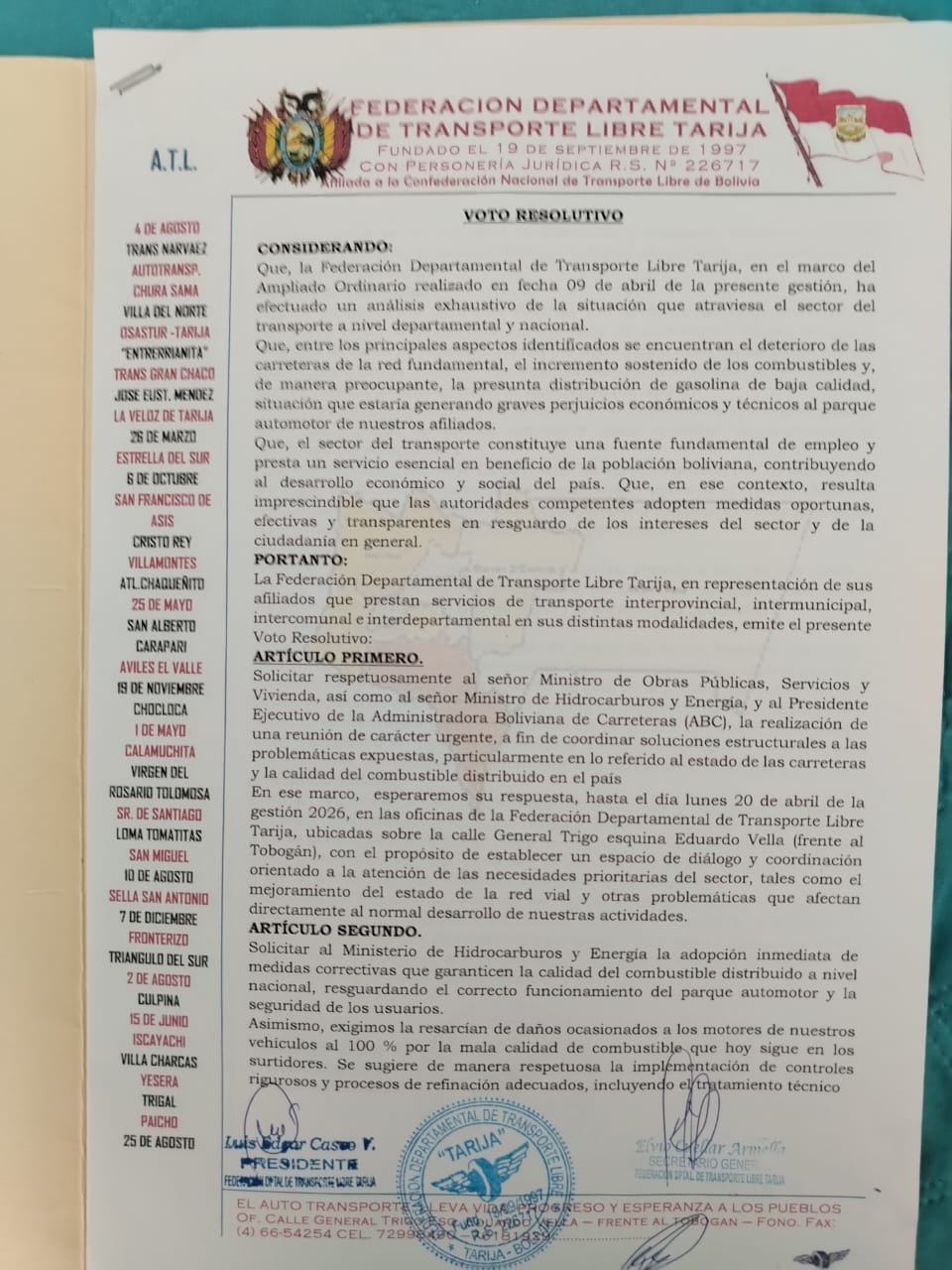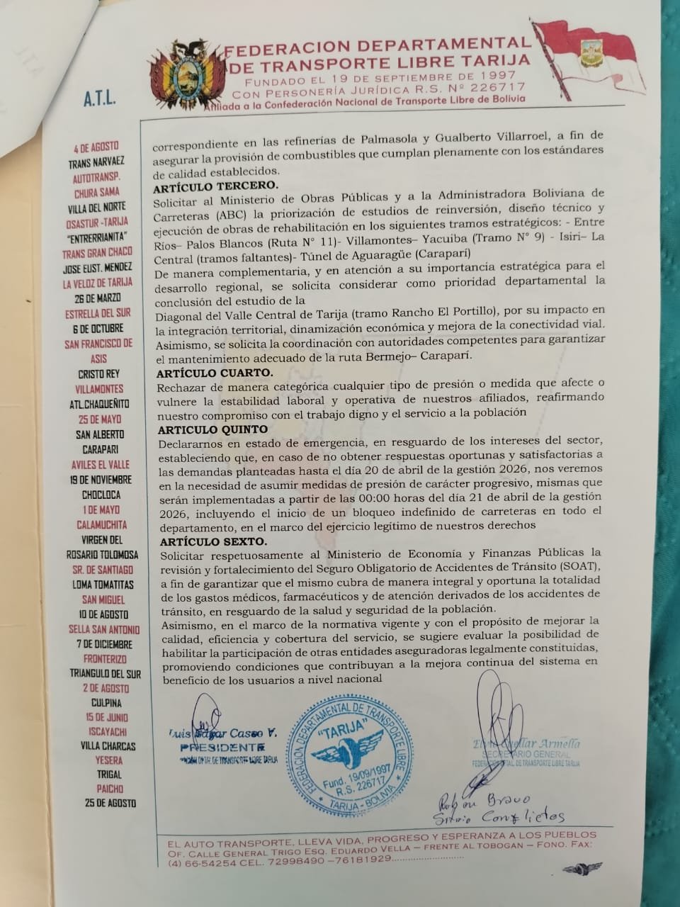 Osmar Arroyo/El AndaluzEl ejecutivo de la Federación Departamental del Transporte Libre en Tarija, Luis Casso informó a El Andaluz que las carreteras en el departamento se encuentran con problemas por los derrumbes en diferentes zonas.La semana pasada el sector se reunió en un ampliado y sacó un voto resolutivo para exigir la presencia de autoridades del gobierno nacional en Tarija y se pueda atender las diferentes demandas.Mencionó que en la zona de San Simón se presentan problemas, que los camiones no podían subir por el desvío habilitado y que una movilidad se habría volcado.Según el dirigente del transporte, hasta el momento no se ve maquinaria pesada grande en el lugar, trabajando, como se había comprometido la Administradora Boliviana de Carreteras (ABC), que a partir del 13 de abril se realizarían los trabajos de limpieza y mantenimiento.«Nosotros les hemos dado plazo hasta el día lunes 20, para que el ministro de Hidrocarburos, porque también tenemos problemas con la gasolina, y el tema camionero y el tema también del SOAT y algunos tramos que son de su competencia y esperemos que ellos bajen hasta el día lunes para una reunión que tengamos», expresó.El transporte envío el voto resolutivo al gobierno en la ciudad de La Paz, para que se puedan atender estos temas.En caso de que las autoridades no bajen a Tarija a reunirse con el sector, indicó que a partir del martes se iniciara con el bloqueo de caminos, de manera indefinida.Remarcó que esa determinación se hizo conocer en el voto resolutivo del sector del Transporte Libre de Tarija.Casso reiteró que el voto resolutivo ya está decepcionado en la ciudad de La Paz y se advierte movilizaciones.La nota se presentó de manera formal, al Ministerio de Hidrocarburos y al Ministerio de Obras Públicas y al presidente ejecutivo de la ABC.«Hemos dado plazo hasta el 20, hasta el día lunes, que ellos vengan aquí a solucionar tres temas importantes, el tema carretero, el tema hidrocarburifero y el tema del SOAT también, que es algo que nos preocupa y creo que hay temas pendientes», apuntó.Señaló que se quieren soluciones estructurales al tema carretero, que ya no se quieren soluciones parche al tema carretero y esperan que al tener autoridades nacionales que son de Tarija, se pueda atender estos temas.Considera que es momento de hacer gestión, viendo que se consiguieron recursos para el proyecto de la Planta de Tratamiento de Aguas Residuales.Destacó que es un proyecto importante, pero dijo que cree que no solo es ese tema que se debe atender, que también es importante el tema carretero.El dirigente del transporte, explicó que el sector ha sido respetuoso con las autoridades nacionales, por eso se enviaron notas a los ministerios y se ha pedido que bajen a Tarija y se genere un acercamiento.«Si hasta el lunes en horas de la tarde no nos convoca a una reunión, si no llegan aquí, el martes a las cero horas empieza el bloqueo en toda la ruta, tanto al norte, a Bermejo, como al Chaco y también el Chaco se está plegando, no solo por eso, por la ruta 9, que también está en mal estado», agregó.Remarcó que, ahora es el momento de exigir atención a las demandas que están pendientes de una solución.Luis Casso dijo que en el tema de la «gasolina basura», tampoco se cumple con el resarcimiento por los daños a los vehículos.En Tarija, no se ha hecho el resarcimiento a ningún afiliado del Transporte Libre y en La Paz, solo se habría resarcido a 18 afiliados, pero el monto económico solo cubriría el 40 por ciento de todo el daño y recordó que el acuerdo con el gobierno, no era ese, que se debía cubrir el 100 por ciento de los daños ocasionados.Según Casso sigue existiendo la «gasolina veneno», que dañan los vehículos y que la única manera de evitar más daños, es llevar esa gasolina a la refinería y limpiarla.Tramo Choere-AcheralPor otra parte, Casso indicó que a la fecha no se tiene información sobre el tramo Choere-Acheral, de cuándo se hará la entrega oficial de la obra, pero que está concluidaRemarcó que ya fue concluido el asfalto y la señalización, que está habilitado, pero no se informó la fecha para la entrega oficial. Navegación de entradasTarija celebra el 15 de abril con la esperanza de avanzar con el desarrollo del departamento y superar la crisis