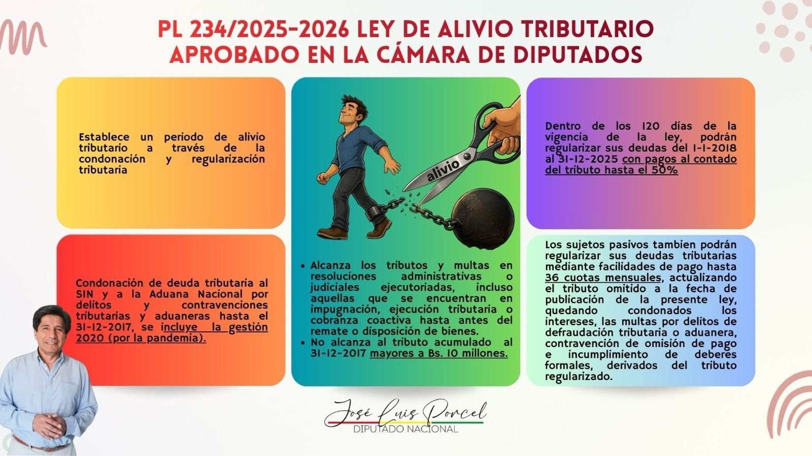Osmar Arroyo/El AndaluzEn pasados días en el pleno de la Cámara de Diputados se aprobó la Ley de Alivio Tributario o más conocida como Ley del «perdonazo».El diputado José Luis Porcel indicó a El Andaluz que la Ley de Alivio Tributario es para todos los que tienen adeudos con la Aduana Nacional o con el Servicio de Impuestos Nacionales (SIN), con montos menores a 10 millones de bolivianos, capital, intereses, contravenciones, multas, sanciones, actualizaciones, personas jurídicas o naturales, podrán acogerse a este «perdonazo».Las personas que tengan deudas, multas o sanciones hasta el 31 de diciembre del 2017 se beneficiarán con esta Ley.Mencionó que esa Ley la presentó el ministro de Economía y Finanzas, José Gabriel Espinoza y que, en el debate en Diputados, se decidió incluir también, toda la gestión 2020, porque fue un año que se vivió la pandemia del COVID 19.Resaltó que está Ley es buena, porque habilitará a muchas personas que han estado entrampados por impuestos o por la Aduana, con demandas acusaciones, resoluciones y a punto de perder sus bienes.El legislador nacional señaló que con la Ley se permitirá que, aquellas empresas, negocios, una librería o una pequeña constructora vuelva a reactivar su actividad.La norma establece la condonación de deudas tributarias a Impuestos y a la Aduana Nacional por delitos y contravenciones.Se señala que, dentro de los 120 días de vigencia de la Ley, se podrá regularizar las deudas que son desde el 1 de enero del 2018 hasta el 31 de diciembre del 2025 con pagos al contado hasta el 50 por ciento.Presupuesto General ReformuladoPor otra parte, el diputado Porcel indicó que hasta este viernes, el gobierno aún no remitió ante la Asamblea Legislativa Plurinacional de Bolivia (ALPB) el Presupuesto General del Estado 2026 reformulado.El presupuesto fue presentado por el ministro, de manera publica el martes pasado, pero al momento todavía no se presentó el proyecto de Ley ante el ente legislativo. Navegación de entradasPresupuesto General reformulado aún no fue remitido a la Asamblea Legislativa