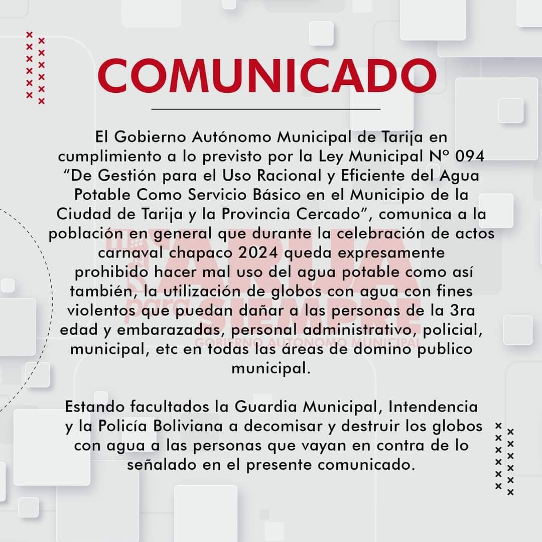 Por Rosy Sánchez/El Andaluz El Gobierno Municipal de la ciudad de Tarija, a través de un comunicado y en cumplimiento…